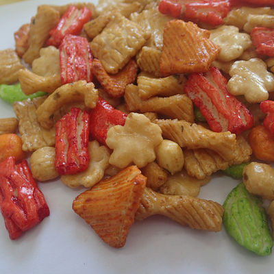 أرز ، فول سوداني ، نشا تابيوكا ، نشا ، مالتو دكسترين ، سكر ، صلصة الصويا ، ملح ، أعشاب بحرية ، E160c ، E150c